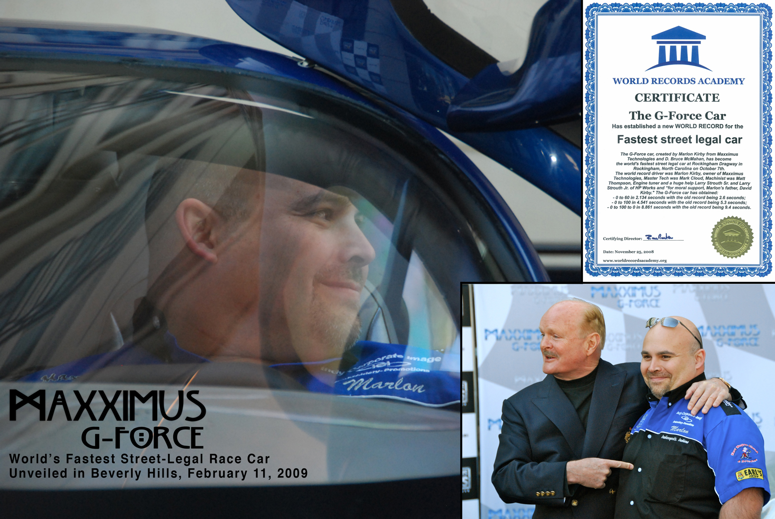 He used to be a mechanic working out of his own garage in Indianapolis, driving a limo on the side to feed his family. Now he's the fastest man in the world - the designer and test driver of the Maxximus G-force, a street-legal car that just broke not one but three world records: 0-60 mph (2.134 seconds); 0-100 mph (4.451 seconds); and the mother of all supercar metrics, the 0-100-0 mph mark of 8.861 seconds.